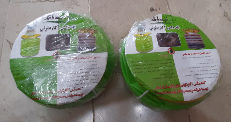 یک بسته پودر را داخل مخزن بریزید بهمراه نیم لیتر آب ولرم.از فاصله ۲متری آویزان کنید .همه ی مگس ها گرفتار مخزن تله میشوند